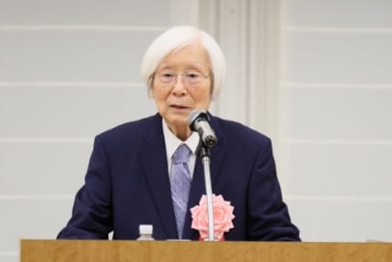 それから、研究助成プログラム「善き未来をひらく科学技術」選考委員長 安岡善文先生ならびに「新産業を生む科学技術」選考委員長 長田義仁先生から、選考講評と助成先に選ばれた研究者への励ましの言葉が述べられました。引き続き、御手洗評議員会議長から研究助成先に決定した15名の研究者へ贈呈証が授与され、研究者を代表して東京大学 大谷 美沙都教授と東京科学大学 清水 秀幸教授が助成のお礼と、今後、この研究助成を糧として研究により一層邁進していくという熱い決意を表明しました。